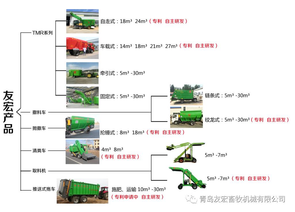 撒料車(chē)-清糞車(chē)-青島友宏畜牧機(jī)械有限公司 青島友宏畜牧機(jī)械有限公司成立于2002年7月,是一家集研發(fā)、 生產(chǎn)、銷(xiāo)售、服務(wù)于一體的高科技企業(yè)。現(xiàn)有員工200余人,占地面積50000平方米,年產(chǎn)畜牧機(jī)械1000多臺(tái)。 公司自成立以來(lái),始終堅(jiān)持以人為本、誠(chéng)信立業(yè)的經(jīng)營(yíng)原則,公司人才結(jié)構(gòu)合理,擁有6位工程師組成的研發(fā)團(tuán)隊(duì),取得專(zhuān)利二十余項(xiàng)。 目前在全國(guó)設(shè)有8個(gè)辦事處,15個(gè)配件庫(kù),產(chǎn)品覆蓋全國(guó)30余個(gè)省份,并遠(yuǎn)銷(xiāo)中東、東南亞、東歐等地區(qū)。 同時(shí)配備了專(zhuān)業(yè)的售后服務(wù)團(tuán)隊(duì),可保證在時(shí)效內(nèi)提供售后服務(wù)和技術(shù)支持。 本公司的主營(yíng)業(yè)務(wù)為:1、TMR飼料攪拌機(jī)(自走式、車(chē)載式、固定式、牽引式、全系5-48m3)2、清糞車(chē)(5m3、8m3)3、青貯取料機(jī)